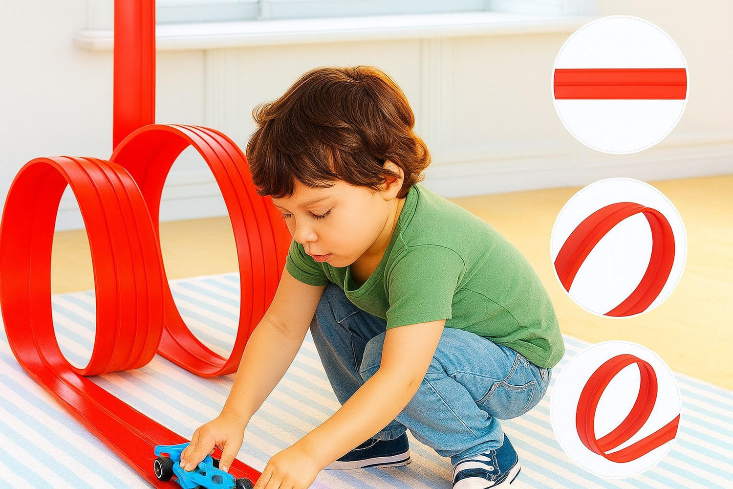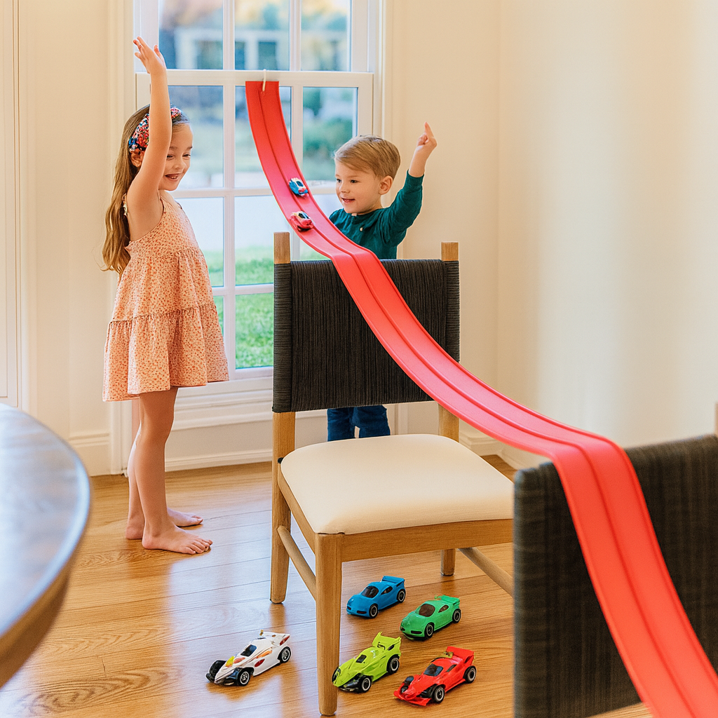 The Racewayrolls FlexiTrack bends, twists, and snaps together effortlessly—then sticks to any smooth surface using its built-in suction cups. You can unroll it on a window, glass door, or wall and design loops, ramps, and jumps using everyday household items. Most standard die-cast cars or monster trucks work perfectly on the track, so once it’s set up, gravity does the rest.